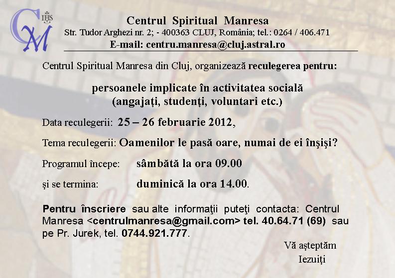 Pentru înscriere sau alte informaţii puteţi contacta Centrul Manresa, centrulmanresa@gmail.com tel. 40.64.71 (69) sau pe Pr. Jurek, tel. 0744.921.777.