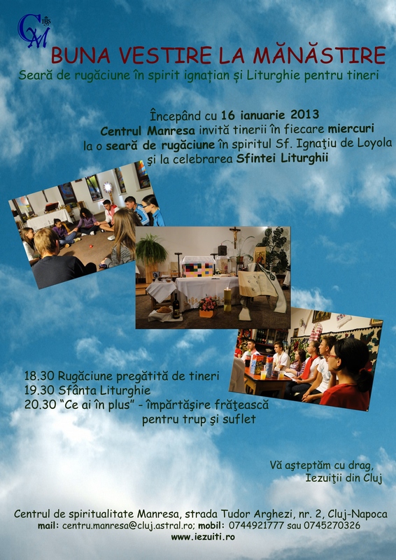 Concret, vă invităm în fiecare miercuri în capela Sf. Ignațiu a Centrului Manresa, începând cu orele 18.30, la o seară de rugăciune în spirit ignațian, urmată de celebrarea Sfintei Liturghii și de o agapă frățească.