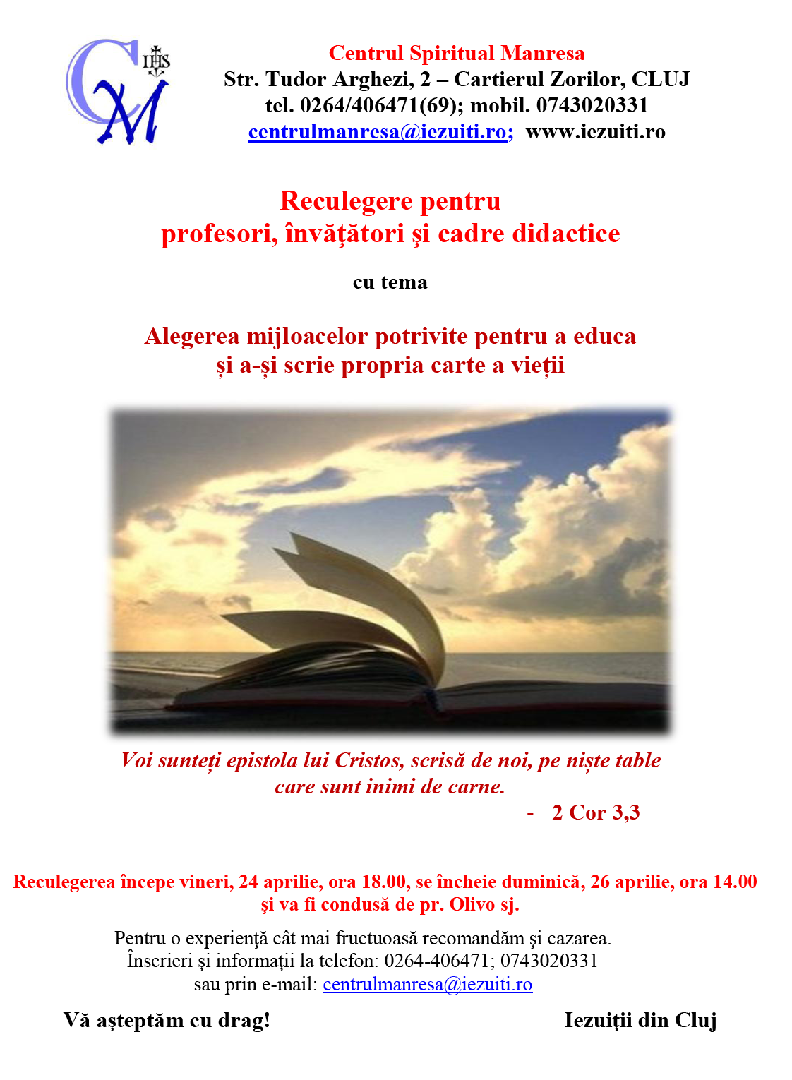 Centrul Spiritual Manresa anunță un timp de reculegere și reflecție pentru profesori, învățători și cadre didactice în perioada 24-26 aprilie.