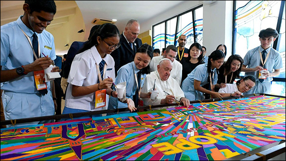 Vă mai las o imagine sugestivă pentru parcursul vostru. Ajungând la Bazilica “Sfântul Petru” la Roma, se traversează piaţa care este înconjurată de grupul de coloane realizat de marele arhitect şi sculptor Gian Lorenzo Bernini. Grupul de coloane, în ansamblul lor, apare ca o mare îmbrăţişare: sunt cele două braţe deschise ale Bisericii, mama noastră, care îi primeşte pe toţi fiii săi. În acest apropiat An Sfânt al Speranţei, vă invit pe voi toţi să experimentaţi îmbrăţişarea lui Dumnezeu milostiv, să experimenteze iertarea sa, iertarea tuturor “datoriilor noastre interioare”, aşa cum era tradiţie în jubileele biblice. Şi astfel, primiţi de Dumnezeu şi renăscuţi în el, să deveniţi şi voi braţe deschise pentru atâţia prieteni ai voştri şi de vârsta voastră care au nevoie să simtă, prin primirea voastră, iubirea lui Dumnezeu Tatăl. Fiecare dintre voi să dăruiască “şi numai un zâmbet, un gest de prietenie, o privire fraternă, o ascultare sinceră, o slujire gratuită, ştiind că, în Duhul lui Isus, asta poate să devină pentru cel care-l primeşte o sămânţă rodnică de speranţă” (ivi, 18), şi astfel să deveniţi misionari neobosiţi ai bucuriei.