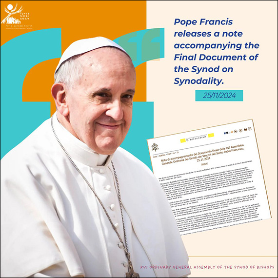 Documentul final al celei de-a XVI-a Adunări Generale Ordinare a Sinodului Episcopilor adună roadele unui drum ritmat de ascultarea poporului lui Dumnezeu şi de discernământul păstorilor. Lăsându-se luminată de Duhul Sfânt, Biserica întreagă este chemată să citească propria experienţă şi să identifice paşii de făcut pentru a trăi comuniunea, a realiza participarea şi a promova misiunea pe care Isus Cristos i-a încredinţat-o. Parcursul sinodal, început în Bisericile locale, a trecut după aceea prin fazele naţionale şi continentale, pentru a ajunge la celebrarea Adunării Sinodului Episcopilor în cele două sesiuni din octombrie 2023 şi octombrie 2024. Acum drumul continuă în Bisericile locale şi în grupările lor, ţinând cont de Documentul final care la 26 octombrie a fost votat şi aprobat de Adunare în toate părţile sale. Şi eu l-am aprobat şi, semnându-l, am dispus publicarea sa, unindu-mă cu acel “noi” al Adunării care, prin Documentul final, se adresează sfântului popor credincios al lui Dumnezeu.