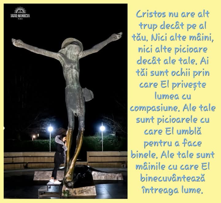 Cristos nu are alt trup decât pe al tău. Nici alte mâini, nici alte picioare decât ale tale. Ai tăi sunt ochii prin care El privește lumea cu compasiune. Ale tale sunt picioarele cu care El umblă pentru a face binele. Ale tale sunt mâinile cu care El binecuvântează întreaga lume. Ale tale sunt mâinile, ale tale sunt picioarele, ai tăi sunt ochii – tu ești trupul Său. Cristos nu are acum alt trup pe pământ decât pe al tău.