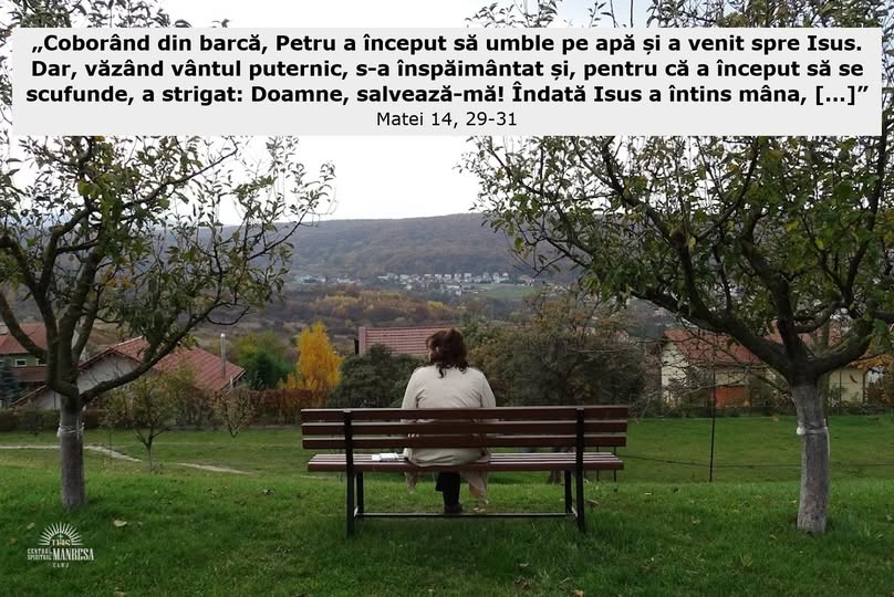Matei 14, 29-31: „Coborând din barcă, Petru a început să umble pe apă și a venit spre Isus. Dar, văzând vântul puternic, s-a înspăimântat și, pentru că a început să se scufunde, a strigat: “Doamne, salvează-mă!” Îndată Isus a întins mâna, […]”