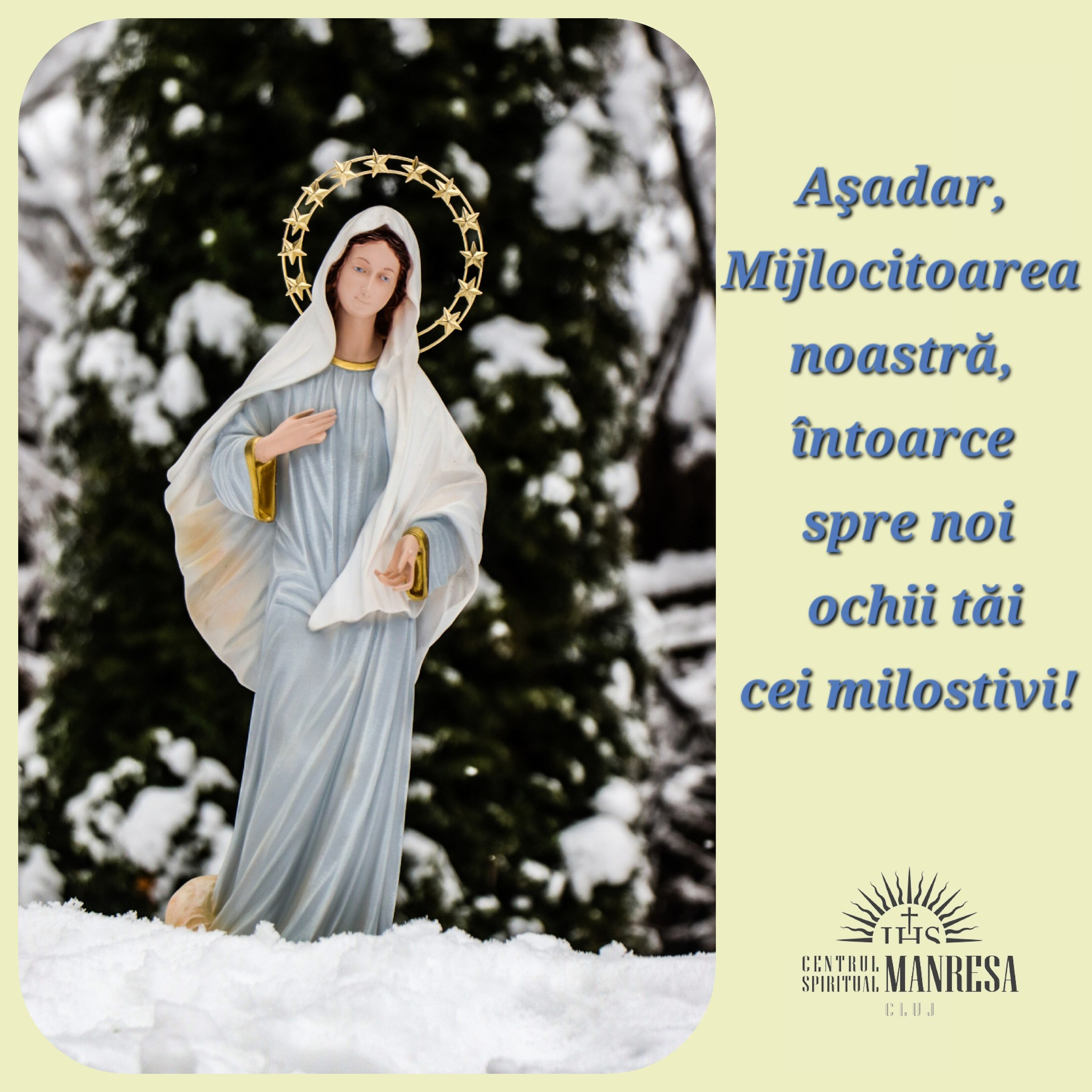Aşadar, Mijlocitoarea noastră, întoarce spre noi ochii tăi cei milostivi, şi după surghiunul acesta, arată-ni-l nouă pe Isus, binecuvântatul rod al trupului tău.