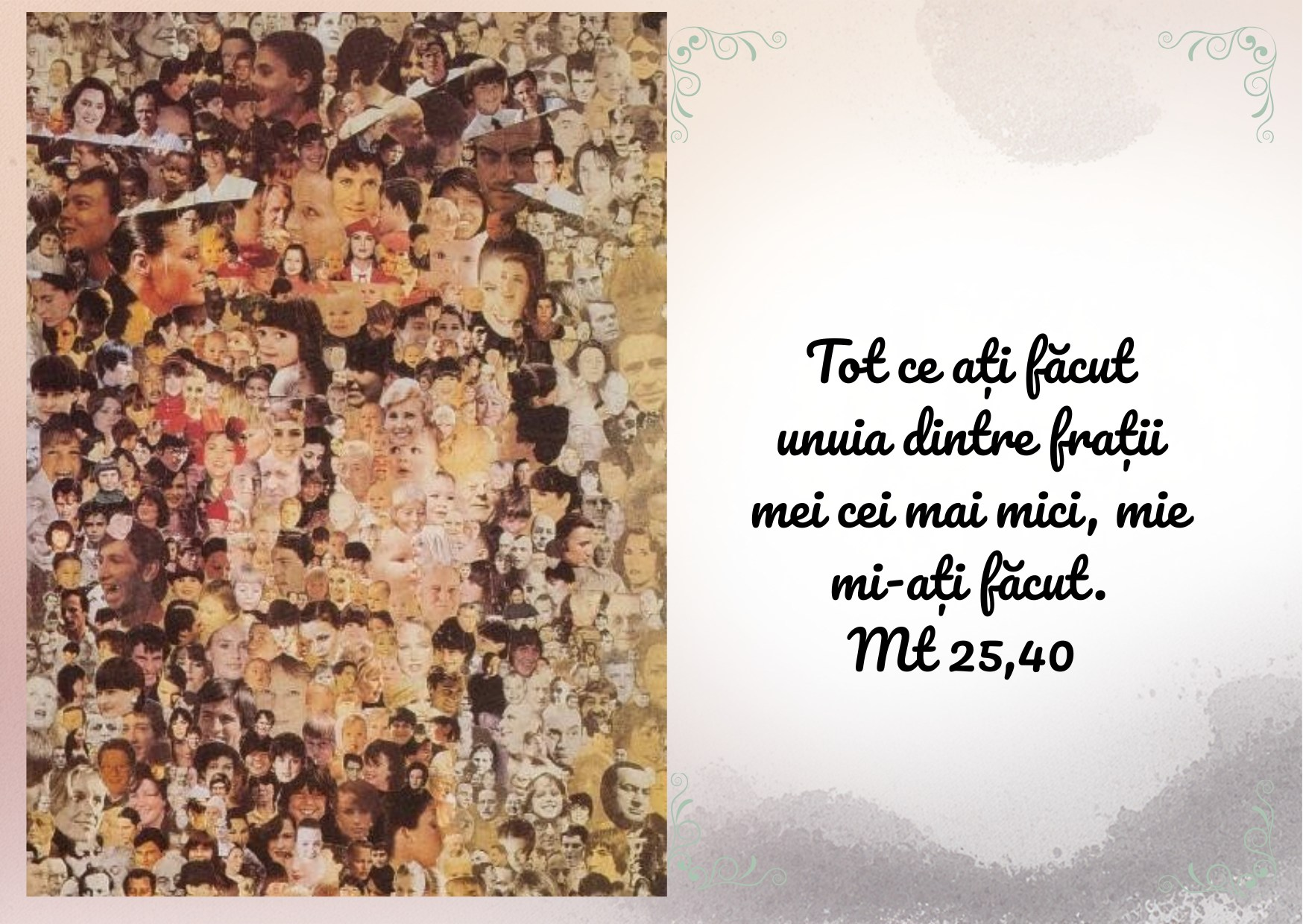 „Tot ce aţi făcut unuia dintre fraţii mei cei mai mici, mie mi-aţi făcut.” Mt 25,40